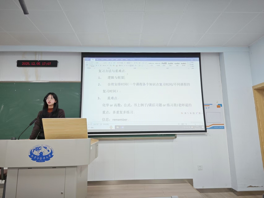 匡逸骏从学习方法论切入,分享了费曼学习法、碎片时间利用等实用技巧。他通过自身经历,演示了如何通过“以教促学”来深化对复杂概念的理解,并提醒大家功夫重在平时。此外,他还贴心关注同学们的身心状态,建议合理安排作息、注意防寒保暖、保持适度运动,以最佳状态迎接考试。