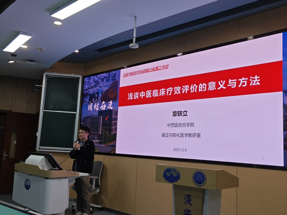 12月8日,学术科研能力拓展工作坊第四期率先开讲。中西医结合学院章轶立副教授以《浅谈中医临床疗效评价的意义与方法》为题,从中医药国际化背景切入,结合青蒿素实例阐释中医药现代价值,对比传统整体思维与现代循证医学特点,解析“创证”“用证”的守正创新路径,并围绕《赫尔辛基宣言》、伦理审查等规范,帮助同学们筑牢科研伦理基石。