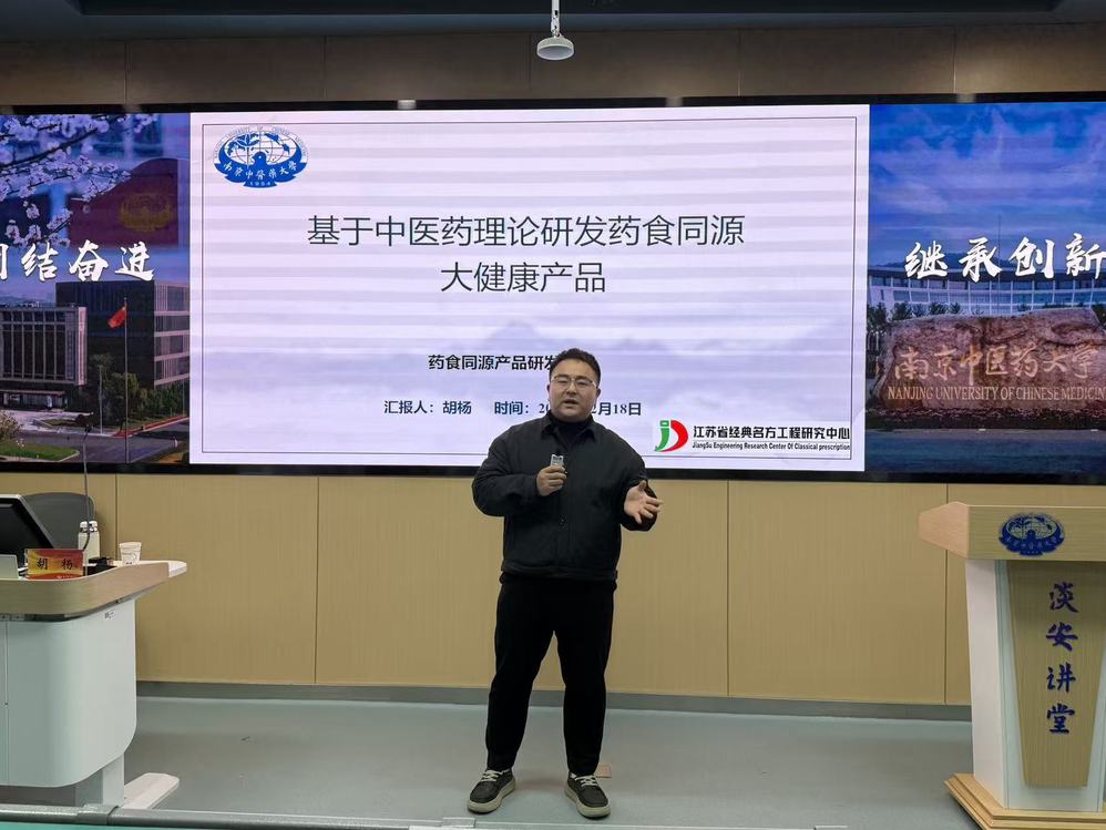 12月18日,第七期工作坊聚焦成果转化,药学院胡杨副教授以《基于中医药理论研发药食同源大健康产品》为主题,从常见植物切入,阐明药食同源产品研发的科研基础与现实意义。他以“九大仙草之首”石斛为例,系统解析了其从资料收集、产品设计到实验验证的完整科研路径,并分享了丹参水苏糖、散寒暖茶等多个成功案例,生动展示了药食同源产品的科研价值。除此以外,胡老师还普及了各类药食同源原料的保健功能,强调科研思维应兼顾科学性、市场性与可行性。